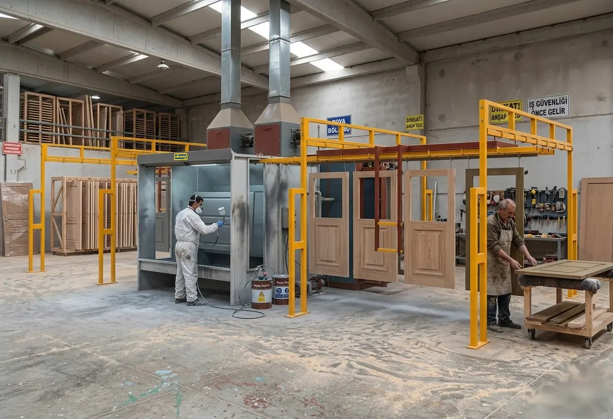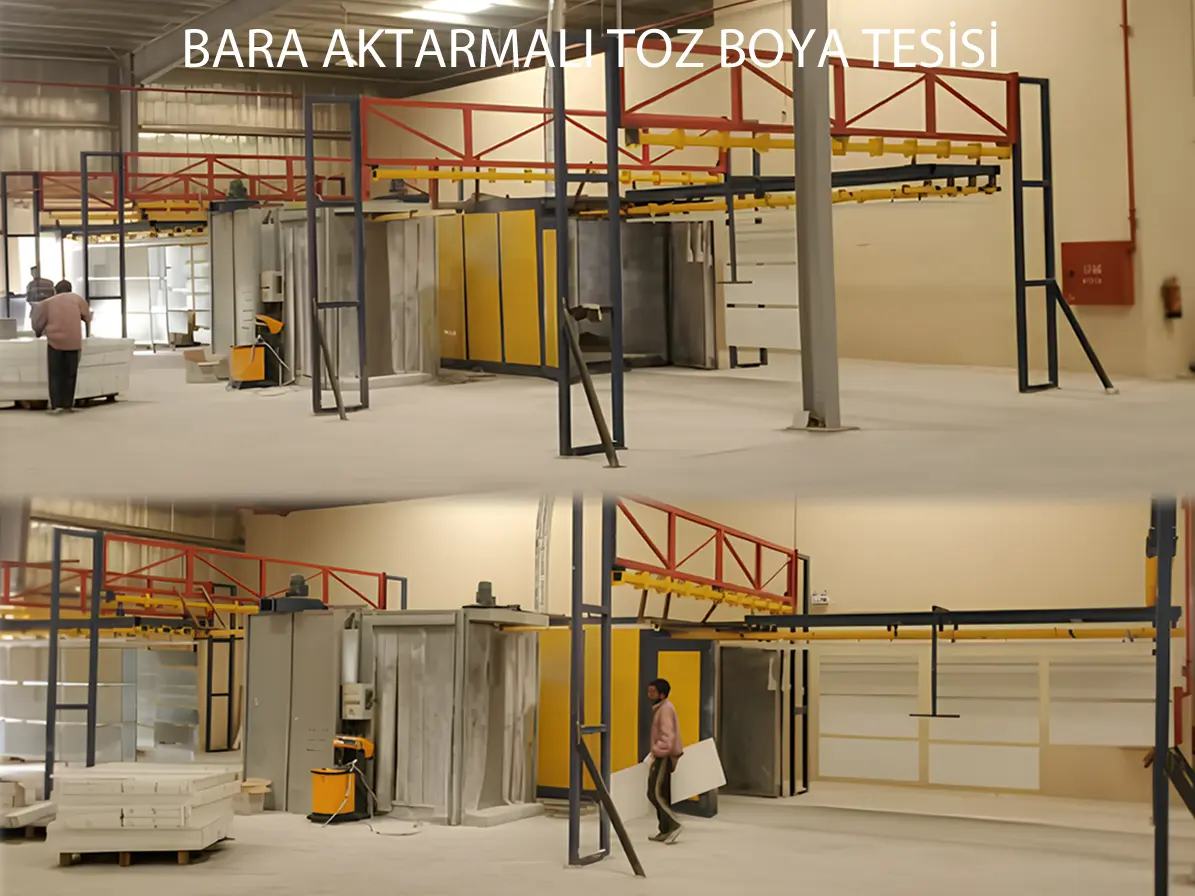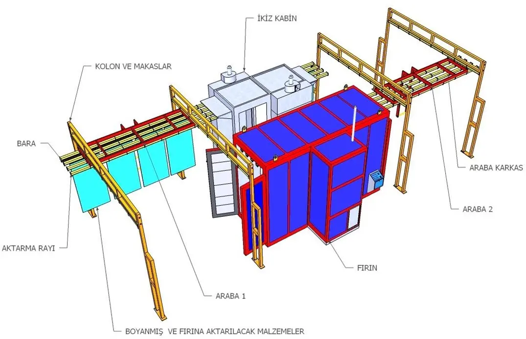 Mekanik Yapı: Tavan rayları üzerine dizili hareketli baralar bulunur. Boyanan parça, makas sistemiyle ana hattan fırın hattına zahmetsizce aktarılır.