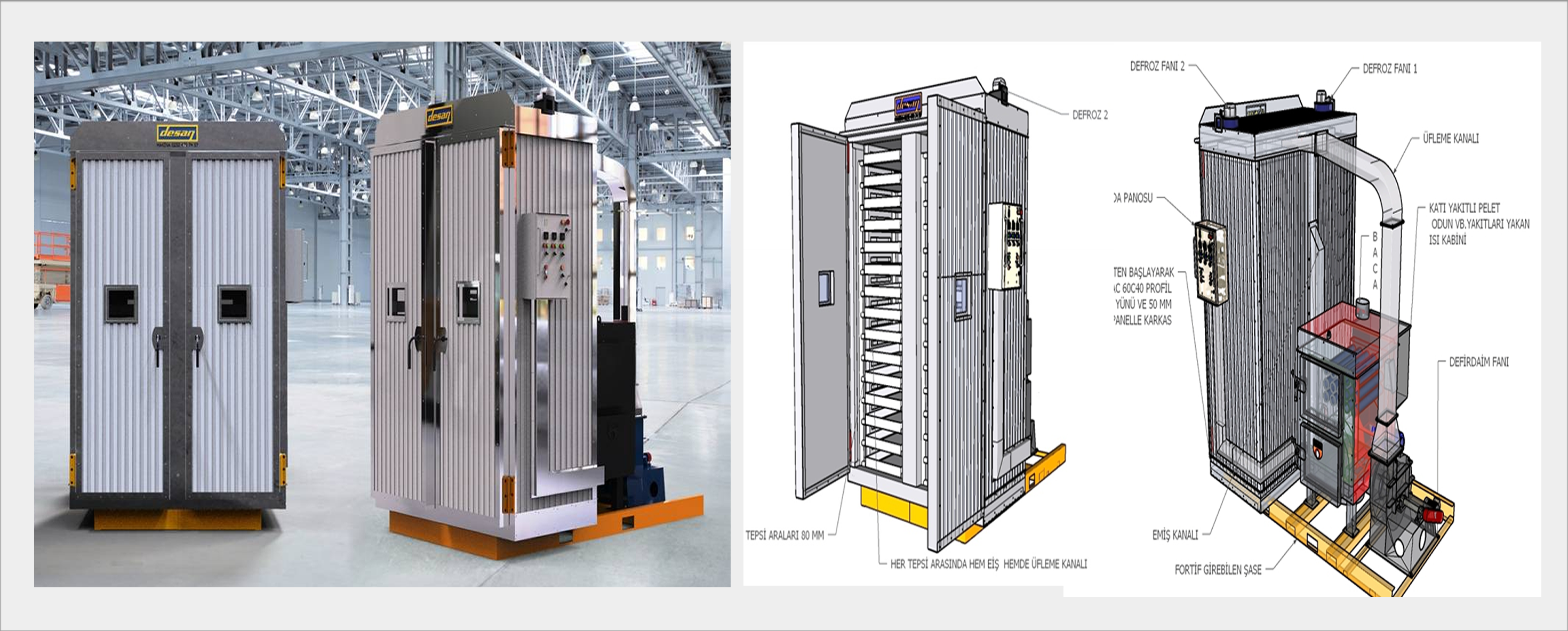 Kurutulacak her türlü ürünü sağlıklı ve hijyenik olarak kurutması icin hava ve hammede temas yüzeyleri kromdur fsanlar ve ısı kazanı ic hava kanalları dahil.Gıda değerlerini değiştirmeden kurutma yapar.