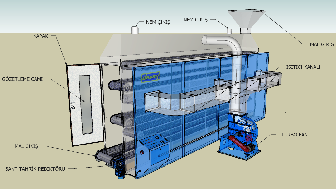 MEYVE VE SEBZELER YIKAMA İLEMİNDEN SONRA ÜZERLERİNDEKİ SUYU UCURMADA KULLANILAN SÜREKLİ HAREKET HALİNDE BİR KONVEYÖR ÜZERİNE SICAK TAZZİKLİHAVA ÜFLENEREK YÜZEYSEL SU UCURMA VE KURUTMA YAPAN GIDA SEKTÖRÜ VE KİMYA SEKTÖRÜNDEDE KULLANILAN TÜNEL TİPİ KURUTUCULARDIR.