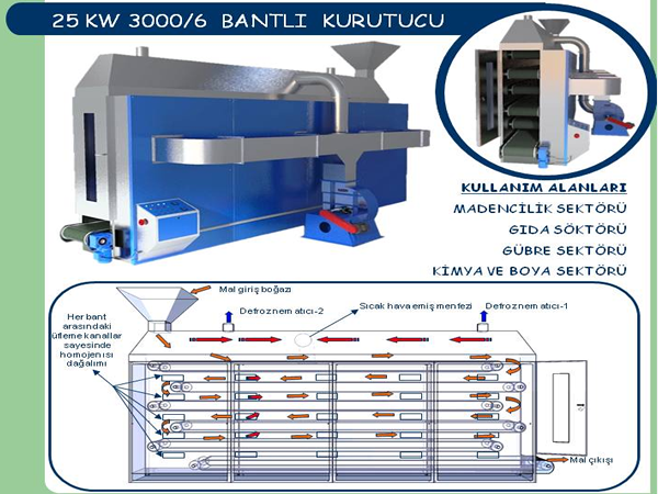Bantlı kurutma fırınları, çeşitli ürünlerin kurutulmasında kullanılan ve kendi grubunda geniş ürün çeşitliliğine sahip makinelerden biridir. Bu fırınlar, ürünü kurutmak için bir brülör aracılığıyla ısı üretir ve kurutma havasını geri kazanarak yeniden ısıtabilir. Ayrıca, bantlı kurutucular ihtiyaca göre farklı tiplerde tasarlanabilmektedir.
